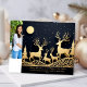 Enjoy sending out a beautiful family of reindeers standing on hills in the forest looking at the sky with stars and moon. Photo template on back and greeting text templates on front. Black background.