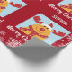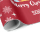 Modern, cute Christmas gift wrap for kids, with Rudolph the Reindeer, the greeting "Merry Christmas" in stylish typography, and a personalised name. On a Xmas red background with snowflakes.
