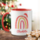 Merry Christmas Santa Hat Rainbow Personalised Coffee Mug features a fun and colourful whimsical rainbow with a Santa Hat below is the text your name in modern red hand written script. To personalise edit the text in the text box provided. View other items in this collection designed by Evco Holidays https://www.zazzle.com/store/evcoholidays