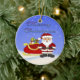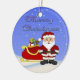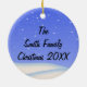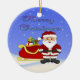 Merry Christmas Santa Round Ornament Front features a snow scene background with falling snow, a Happy Santa standing next to his sleigh full of toys. Decorative purple and blue text is Merry Christmas. Back features a snow scene background with falling snow and text for your Family Name and date or any text you'd like. Perfect keepsake gift for Christmas!