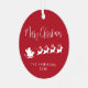 Fun seasonal red and white Christmas tree ornament featuring a silhouette of reindeers flying Santa's sleigh through air and "Merry Christmas" in a stylish modern script and your name or other text below. Add a photo on the back.