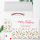 Attractive white envelope with watercolor greenery, holly and Christmas star cookies pattern on back low area as well as decorative stripe on the front. Top back flap with beautiful "Merry Christmas" phrase in red hand written Calligraphy framing your name(s) and return address information. Inside watercolor small greenery element with red banner with two text areas for message giving you the ability to really personalise this design and make it your own. Collection with coordinating products available.