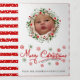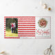 Red Merry Christmas script typography and wreath photo Holiday Card. This festive design displays a Christmas wrearth as a frame for your photo and the text "Merry Christmas" in modern script typography in red on the cover. More photos on the inside first and last panel while the middle inside holds your wishes. A pattern made of red and white stripes with snow covers the back and forms frames for the photos.