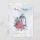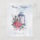 Lovely watercolor style modern "Merry Christmas" greeting in custom blue calligraphy script graphic, artistic lantern, spray of poinsettias, greenery and rustic twigs on pale blue watercolor wash background with editable text fields. Back features complementary floral graphics and additional text fields.