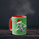 This coffee or tea mug has a silly skeleton holding snowflake covered red and green ornaments up to his eyes wearing a red Santa hat in between the red text Merry Christmas on a green background with tiny golden flecks.