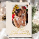 Merry Christmas Simple Modern Coquette Bow Photo Foil Holiday Card Foil Stamped Christmas Cards features a simple design with your favourite photo with the foil text overlay "Merry Christmas" in modern calligraphy script typography accented with a foil stamped bow on a beige background. Personalised your names or custom text below and your custom message on the reverse. Perfect for family and friends to celebrate Christmas and the holidays. Designed by ©2025 Evco Studio www.zazzle.com/store/evcostudio