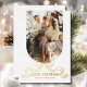 Merry Christmas Simple Modern Coquette Bow Photo Foil Holiday Card Foil Stamped Christmas Cards features a simple design with your favourite photo with the foil text overlay "Merry Christmas" in modern calligraphy script typography accented with a foil stamped bow on a white background. Personalised your names or custom text below and your custom message on the reverse. Perfect for family and friends to celebrate Christmas and the holidays. Designed by ©2025 Evco Studio www.zazzle.com/store/evcostudio