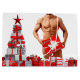 Merry Christmas SlipperyJoe red white silver gift boxes bows muscular male chest shirtless man holiday ornaments artistic tree festive background six-pack stomach gay pride gifts LGBTQIA bold unique holiday cheer various wrapped presents
