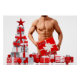 Merry Christmas SlipperyJoe red white silver gift boxes bows muscular male chest shirtless man holiday ornaments artistic tree festive background six-pack stomach gay pride gifts LGBTQIA bold unique holiday cheer various wrapped presents