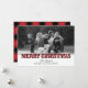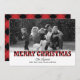 Modern "Happy Holidays" photo card includes a large photo space and black text that can be personalised. Features a rustic red and black buffalo plaid pattern on the front and back sides of the card with faux snow and black and white filter. <i>Photography © Storytree Studios, Stanford, CA</i>