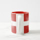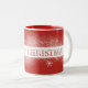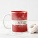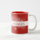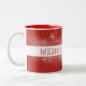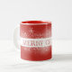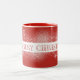 • Beautiful red and white "Merry Christmas" banner around the centre of the mug on a red background dusted with snow and intricate snowflakes