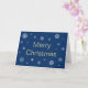 A classic and timeless holiday card for anyone! Merry Christmas in gold. White and gold snowflakes. Dark blue background. The inside of the card is blank.