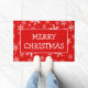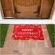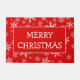 This doormat features a customisable greeting, currently reading "Merry Christmas" with a white trimmed red rectangle on a red background covered in various sized snowflakes. Easily change the greeting to "Season's Greetings" or any other similarly sized phrased right on the product page!