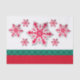 The design features red stylised snowflakes and green plaid ribbon on a red background