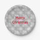 Fancy white snowflake pattern on shimmering silver grey background with red Merry Christmas text.