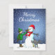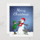 Merry Christmas Card with an illustration of a boy and dog building a snowman.