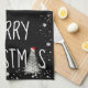 Snowman on Merry Christmas text with white pine tree and snowflake border.