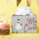 Red Merry Christmas text and snowman on grey background with snowflakes.