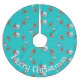 Christmas tree skirt in sea-blue colour with pattern of starfish and custom text. The skirt wraps around the base of a tree, without ties or snaps, and is a pretty tropical blue colour. "Merry Christmas" wording curves across the front, or change it to a family name or other text that fits. Little brown sea star and aqua blue ornament images are scattered over the skirt. Choose from three fabrics.