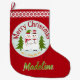 Decorate your mantle with this cute personalised Christmas Stocking. The stocking features a folksy snowman couple surrounded by festive Christmas trees on a light mint green medallion against a red striped background. The Snowman design reads, "Merry Christmas and a Happy New Year" in red and golden yellow. Just below that is a space for your name in green and white. The back is red with a space for the date in a pale mint green. Click customise to change the fonts, resize or re-position the text or graphics - edit it however you like. Merry Christmas!