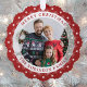 Stylish Modern and elegant, scallop shaped, holiday greeting photo card ornaments. These large ornaments also serve as greeting cards with editable text fields on front and back. This custom design features your personal photo on the front highlighted in a unique gradient frame and finished off with delicate white snowflakes on a regal red background. Happy Holidays, Merry Christmas or enter your own desired greeting. The perfect keepsake gift and décor for the holidays.