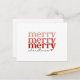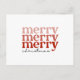 This festive postcard has the text Merry, Merry, Merry in shades of pink and red as well as the text Christmas in black. This classic and retro style card adds a great custom touch to your seasonal greetings. (Background white colour may be changed per your preference -- just go into the personalisation area.)