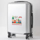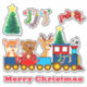 This whimsical sticker features three adorable animals, a cat, bear and reindeer, riding in a Christmas train. The train is decorated with Christmas stockings and a tree.