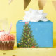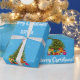 Modern Christmas gift wrap for kids, with a Christmas tree decorated with baubles, lights, and candy canes; the greeting "Merry Christmas" in stylish typography, and a personalised name. On a blue background with snowflakes.