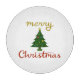 'Merry Christmas' in faux gold colour and red script with illustration of a Christmas tree decorated with baubles and stars illustration centre.