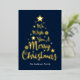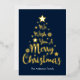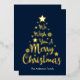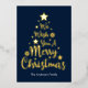 We wish you a Merry Christmas in script style font in a tree shape gold foil Christmas card. You can customise to enter your family name and also to change the dark blue background colour if you like.
