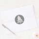 This modern round sticker features a white pine silhouette with little white snowflakes on a silver-grey background.