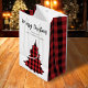 This design features a Merry Christmas calligraphy script gift bag with a simple cute red and white and black buffalo check pattern, a minimalist minimal classic whimsical, fun festive bright bold red, simplistic basic plain red white, merry Christmas greeting saying, a custom customised personalised from, a cute whimsy gift wrap bag, Christmas holiday gift wrap supplies, Christmas holiday wrapping supplies
