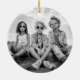 Round ceramic ornament featuring the text "Merry Christmas" in colourful, retro font and customisable family name and year. On the back is a template for your custom photo.