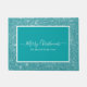 Elegant Merry Christmas Doormat with a white script on a turquoise glitter background. Personalise with your family name or text.