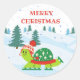 Cute turtle ice skating in winter with snowfall and Merry Christmas stickers design