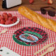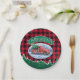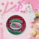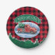 Decorative personalised paper plates are the perfect compliment to your christmas party. This design features a winter scene of a vintage red pickup truck driving through the snow with a fresh Christmas tree in the back. A green banner above has a "Merry Christmas" greeting. Background is a red and black buffalo check pattern with a border of green pine trees and a sprinkling of snow. Designed by artist © Tim Coffey.