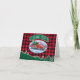 This holiday design Thank You note features a winter scene of a classic red pickup truck driving through the snow, a fresh Christmas tree in the back. A green banner above reads "Thank You". Background is a red and black buffalo check pattern. Designed by world renowned artist © Tim Coffey.