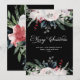 This beautiful, non-photo holiday card says "Merry Christmas" in elegant modern calligraphy, with traditional Christmas watercolor flowers in red, white, and green on a black background. The perfect festive card to send to friends and family, yet professional enough to give to business customers and clients.