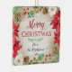 "Merry Christmas Script Typography, Watercolor Floral Pine and Holly Wreath, Rustic Wood with Family Photo Ceramic Ornament." Artwork was painted by internationally licensed artist and designer, Audrey Jeanne Roberts, copyright.