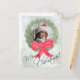 This beautiful hand painted watercolor postcard is a great way to send holiday greetings. It features your photo inside a wreath of pine branches and berries with a big red bow on a marbled green background. The caption reads: Merry Christmas! There is space for a short greeting and signature on the back.