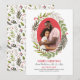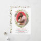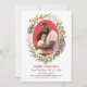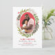 Merry Christmas! This elegant and modern dual purpose holiday greeting card and wedding save the date announcement features a beautiful red and green watercolor greenery oval wreath design with leaves, branches, berries, and foliage that beautifully frame your favourite portrait photo. Personalise with an engagement picture of the Future Mr and Mrs and add your custom save the date information. A coordinating floral pattern dresses up the back of the card. Design includes classic red and green shades with accents of rose pink, neutral taupe, grey, and white.