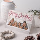 Cute holiday photo card with "Merry Christmas" featured at the top of the card in a cranberry handwritten script. Personalise the whimsical Christmas card with your horizontal photo and family name on the front. The inside of the card features an additional photo with space for your custom message in cranberry lettering. The back of the card displays a cranberry and white snowflake pattern.