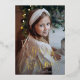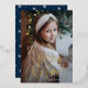 Cute holiday photo card with "Merry Christmas" featured at the top of the card in a handwritten gold foil script. Personalise the whimsical Christmas card with your vertical photo and family name. The card reverses to a navy and white snowflake pattern.