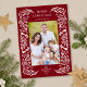 A vertical photo Christmas card showcasing elegant white winter holiday greenery on a dark red background.