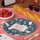 Paper plates with a whimsical festive pattern. Polar bears, reindeers, trees. foxes, and snowflakes. On a dark green background. A rectangle frame with a faux gold foil border with Merry Christmas, written inside.