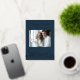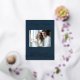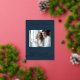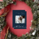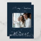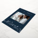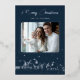 Share the peaceful charm of a winter's night with this stunning holiday card featuring a cozy village scene. The deep navy blue background beautifully contrasts the delightful illustration of snow-covered houses, trees, and stars, all glowing in brilliant silver foil. Your favorite family photo is elegantly framed in the center, while the handwritten-style "Merry Christmas" greeting also shines in matching silver foil, creating a serene and magical announcement.