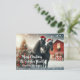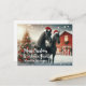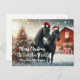 Merry Christmas with two black horses wearing a santa hat with a decorated Christmas tree and red barn personalised Postcard