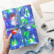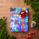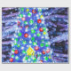 Merry Christmas stylish blue typography, with a vibrant Christmas tree with green, red and yellow ornaments and a colourful, snowy night sky background repeating pattern design for your festive cheer.