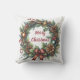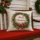 Welcome guests to your home with a Merry Christmas porch pillow. This pillow features a watercolor illustration of a festive holiday wreath and a Merry Christmas greeting. The wreath was created with AI tools and designed by Susang6.