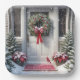 A warmly decorated front door is adorned with a festive wreath and flanked by snow-covered trees and poinsettias.